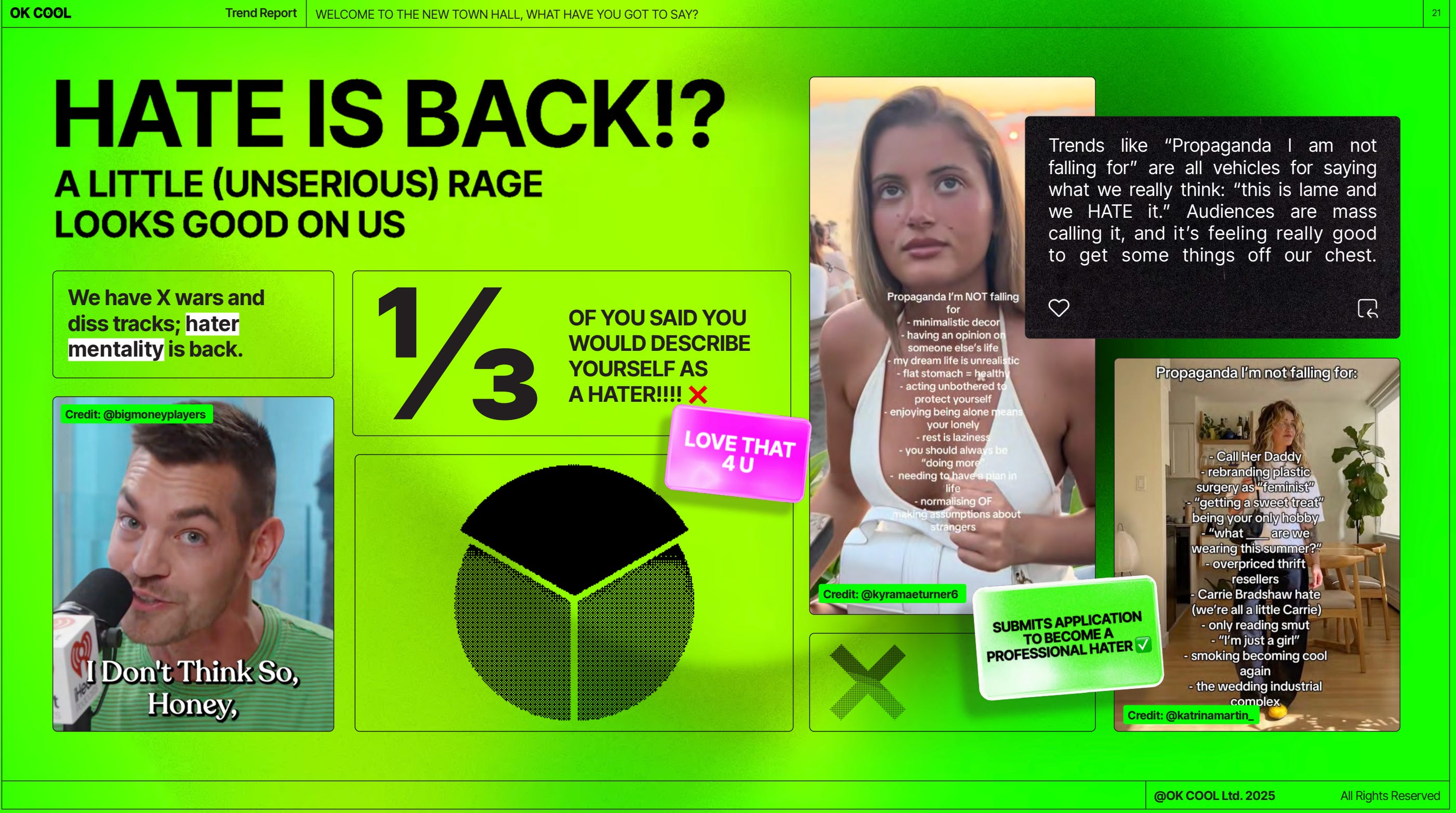 Dans les Stories Instagram, par exemple, la peur de poster un contenu nuancé qui ne va pas dans le sens d’une communauté polarisée est palpable. C’est flagrant lors des conflits géopolitiques, mais c’est également le cas pour des grands enjeux de société (le féminisme, la santé…) : les DM reçus exercent une forme de pression et accélèrent la dichotomie entre “alliés” et “ennemis”. Il est plus facile de camper dans une position tranchée, en émettant des contenus qui corroborent l’opinion de sa communauté au risque de se faire "excommunier" numériquement par ses propres abonnés… ou, cas plus perturbant sur TikTok, par des anonymes qui vous jugent en quelques secondes.
